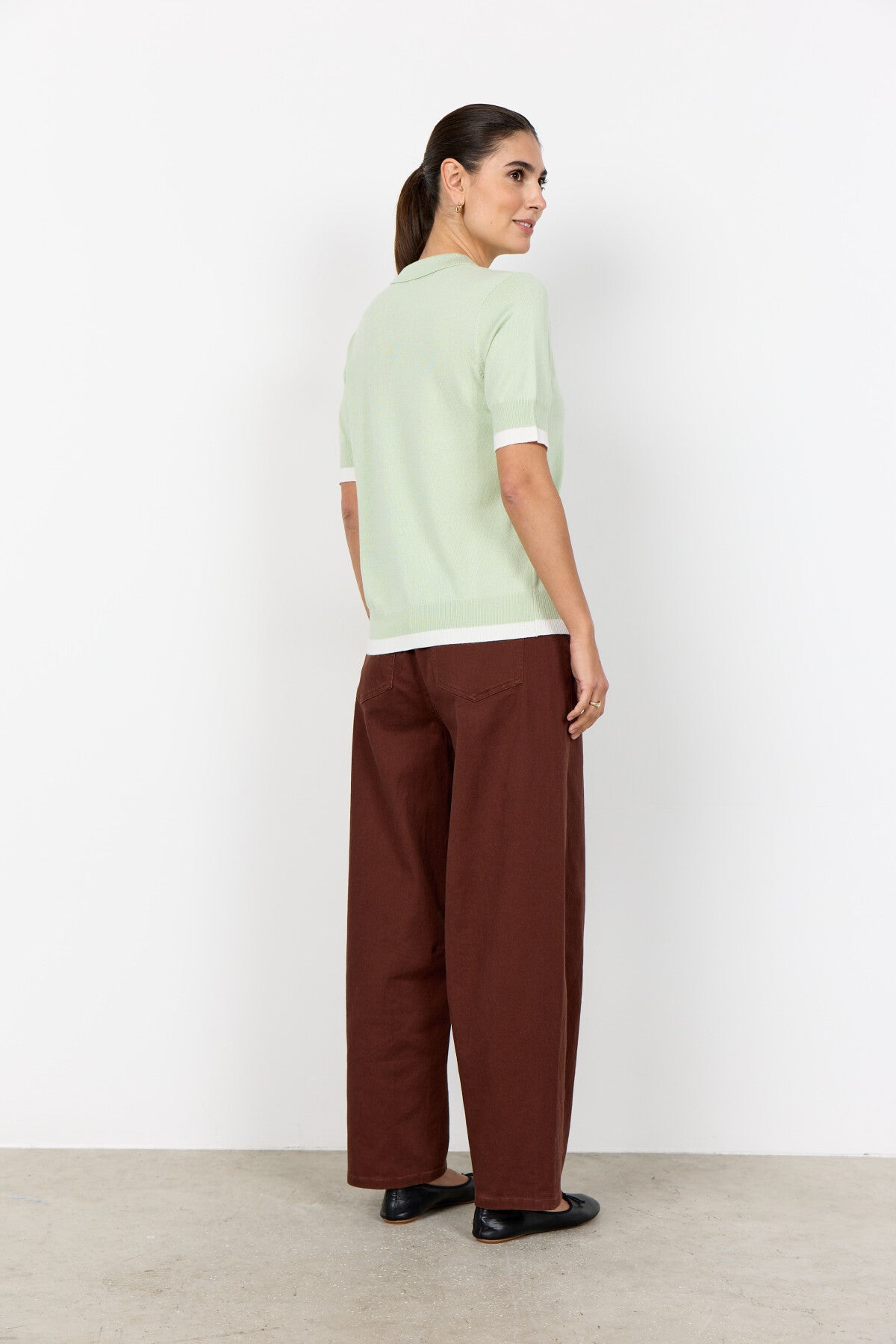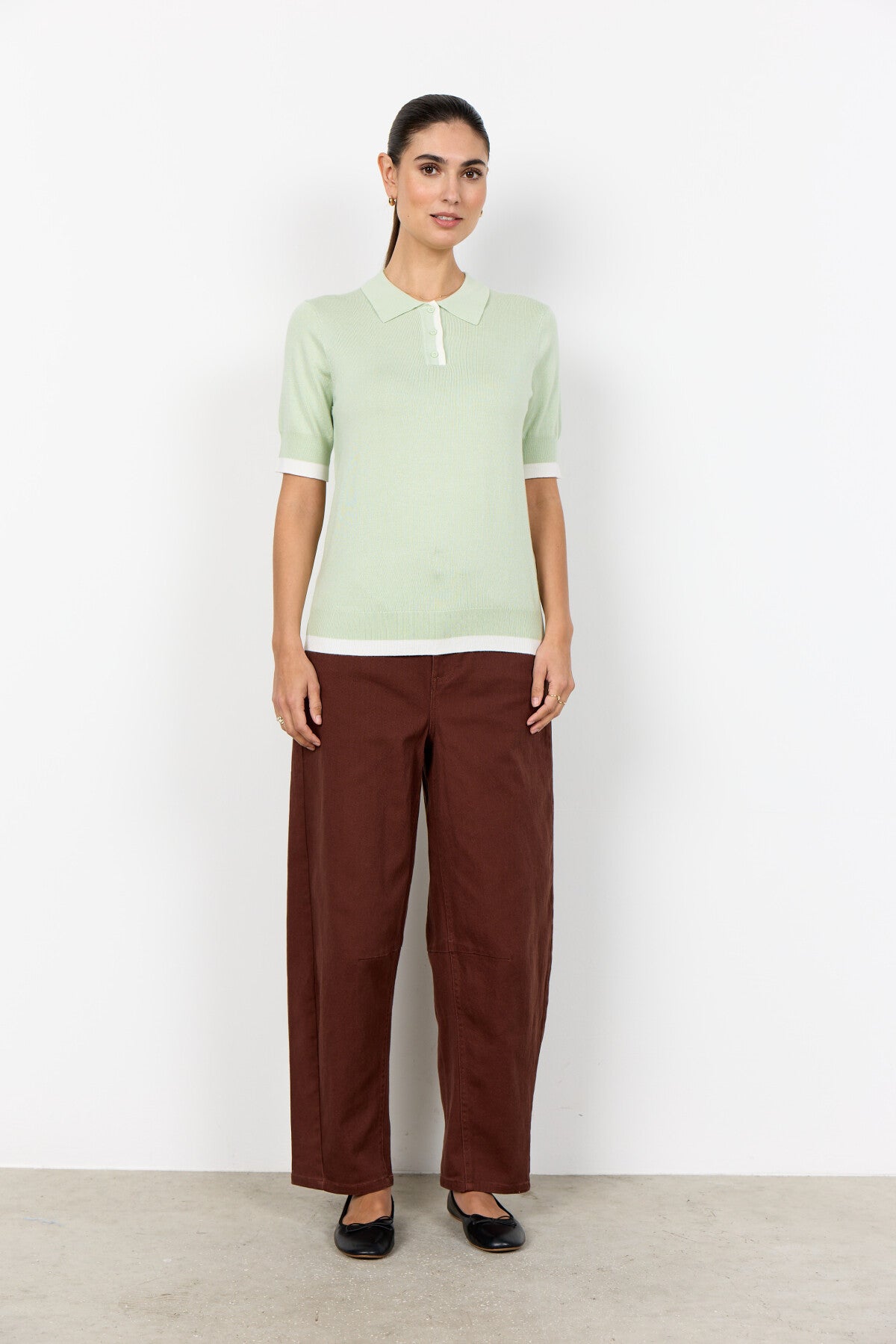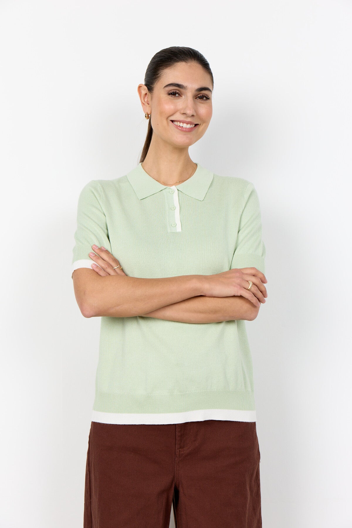 SC-DOLLIE 815 är en pullover tillverkad av 75% viskos, 25% nylon. Denna eleganta pullover har en klassisk polokrage med knappdetaljer och korta ärmar, kompletterad med en subtil textur. Kombinera den med skräddarsydda byxor eller kjolar för en cool och sofistikerad look.