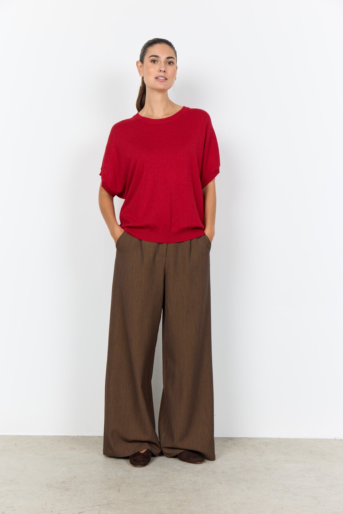 SC-DOLLIE 807 Pullover är tillverkad i en blandning av 75% viskos och 25% nylon. Den har en klassisk krage med rund hals, korta ärmar och en ribbad nederkant som framhäver den avslappnade silhuetten. Denna eleganta pullover passar perfekt till skräddarsydda byxor eller avslappnade jeans för en stilfull look.