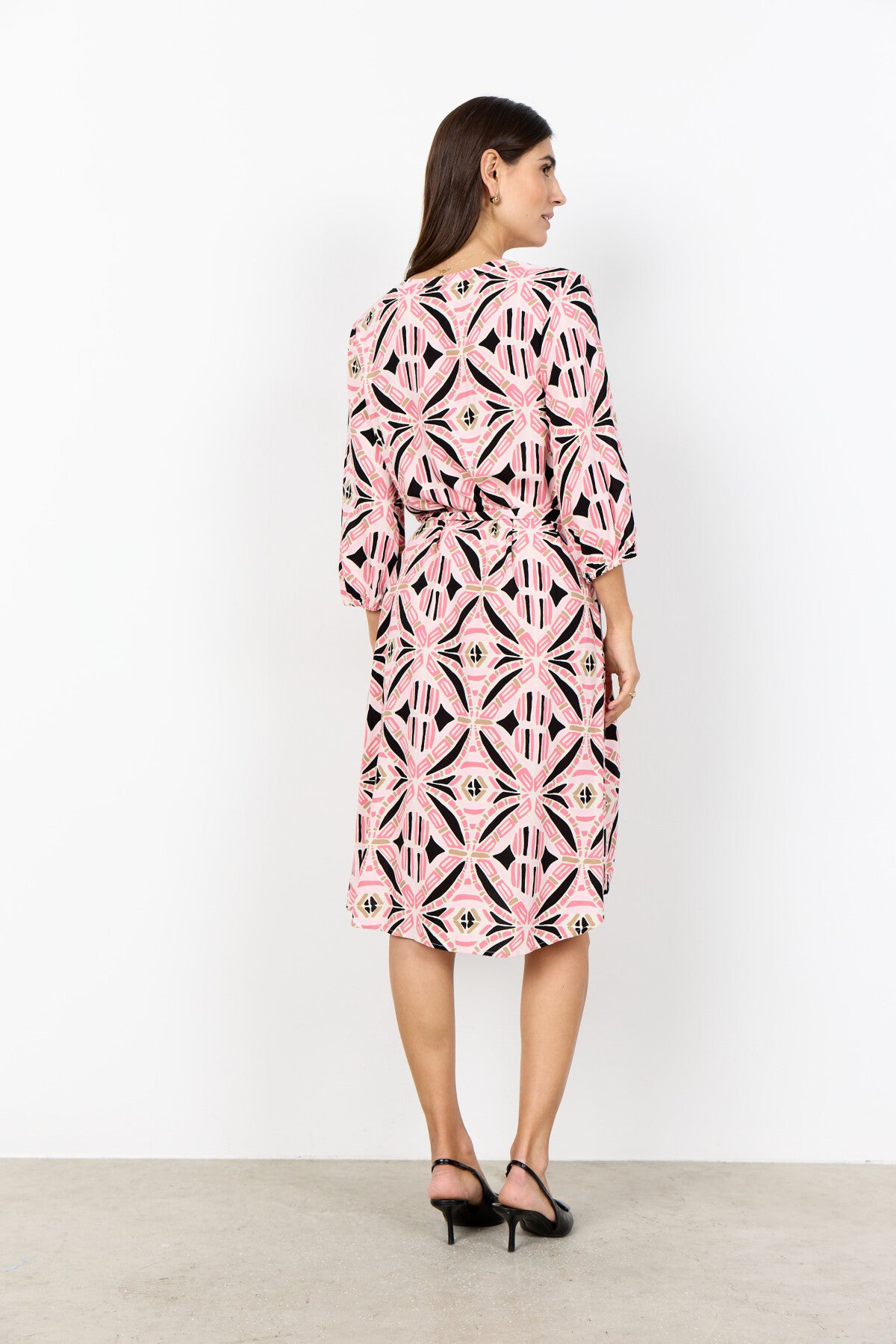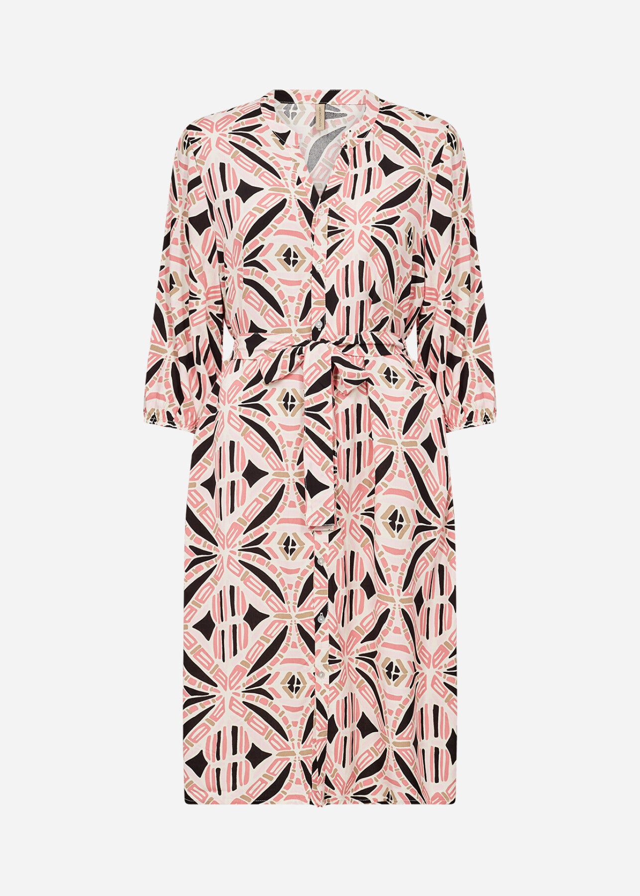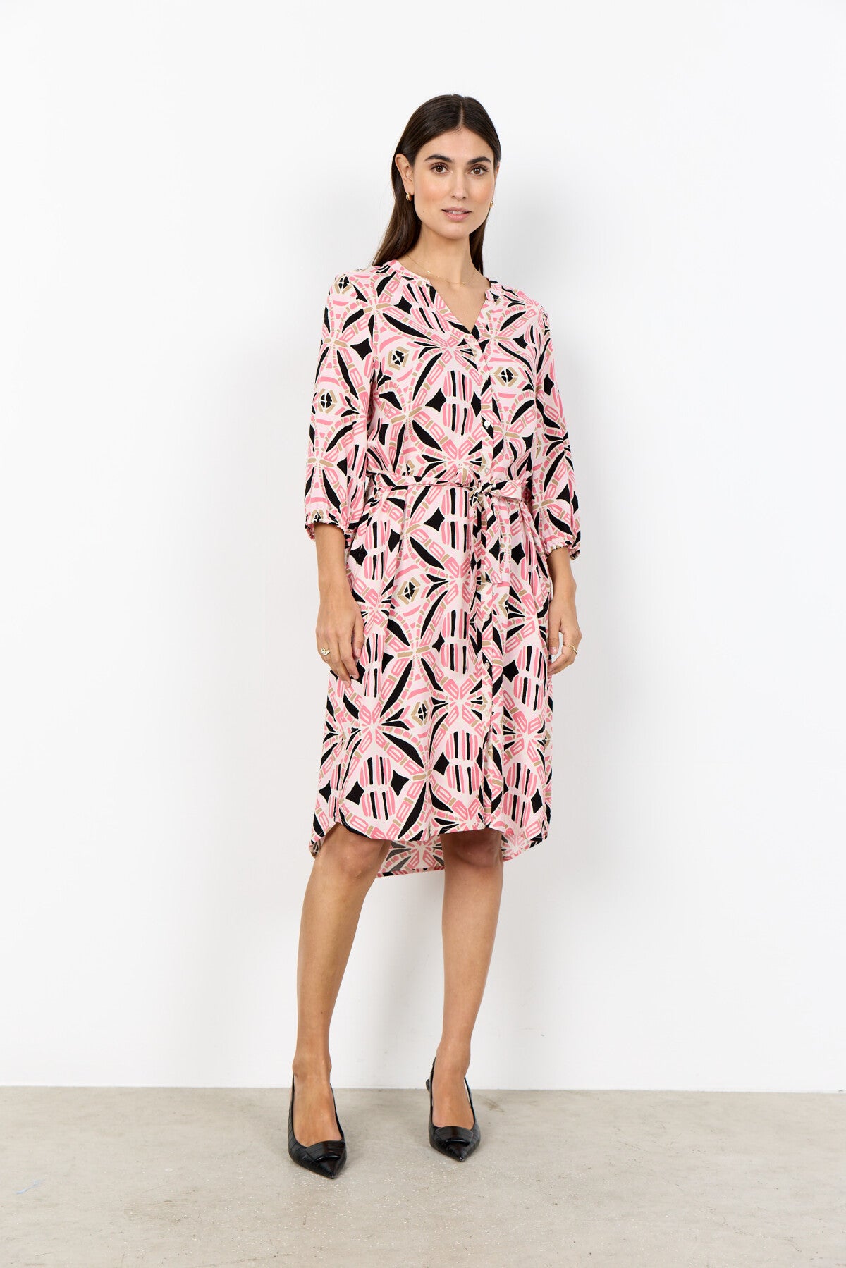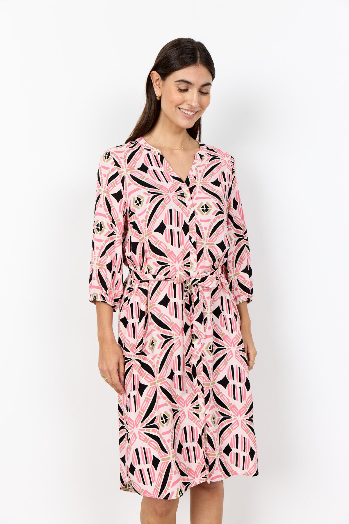 SC-CASSIEL 3 Dress är tillverkad av 100% LENZING™ ECOVERO™ viskos. Klänningen har en klassisk V-ringad krage, knappar framtill och ett slående geometriskt tryck med ett midjeband som ger en smickrande touch. Kombinera den med ankelboots eller sandaler för en elegant och raffinerad look.