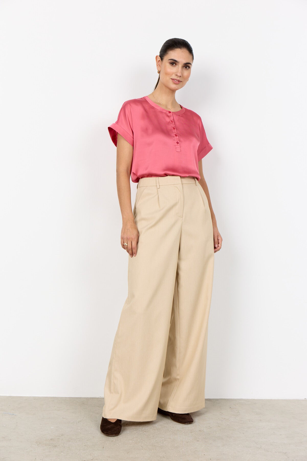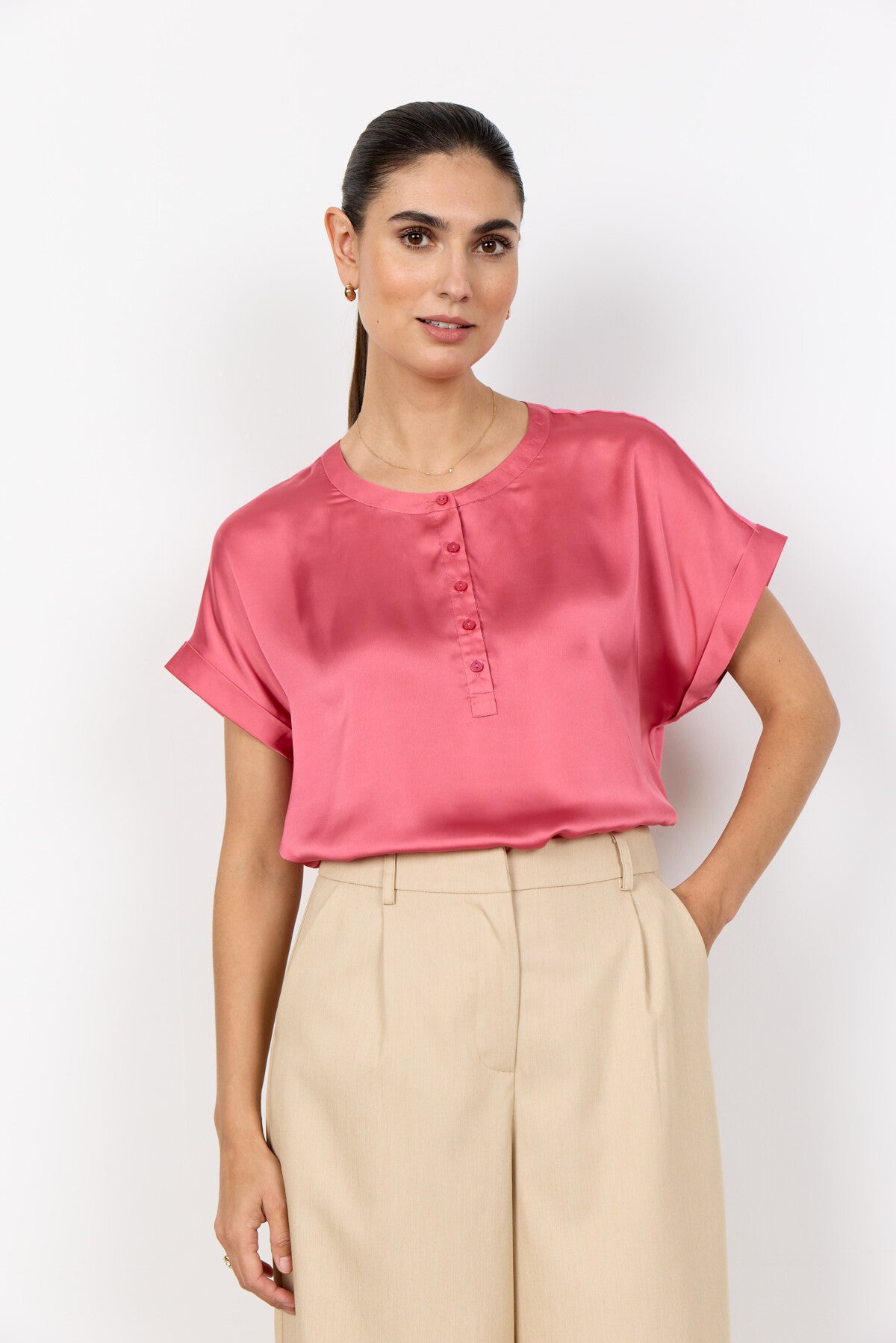 SC-THILDE 50 T-shirt är tillverkad av 95% LENZING™ ECOVERO™ viskos, 5% elastan. Den har en rund halsringning med knappdetaljer och korta ärmar, vilket ger den en avslappnad passform. Kombinera den med skräddarsydda byxor eller avslappnade jeans för en enkel men elegant look.
